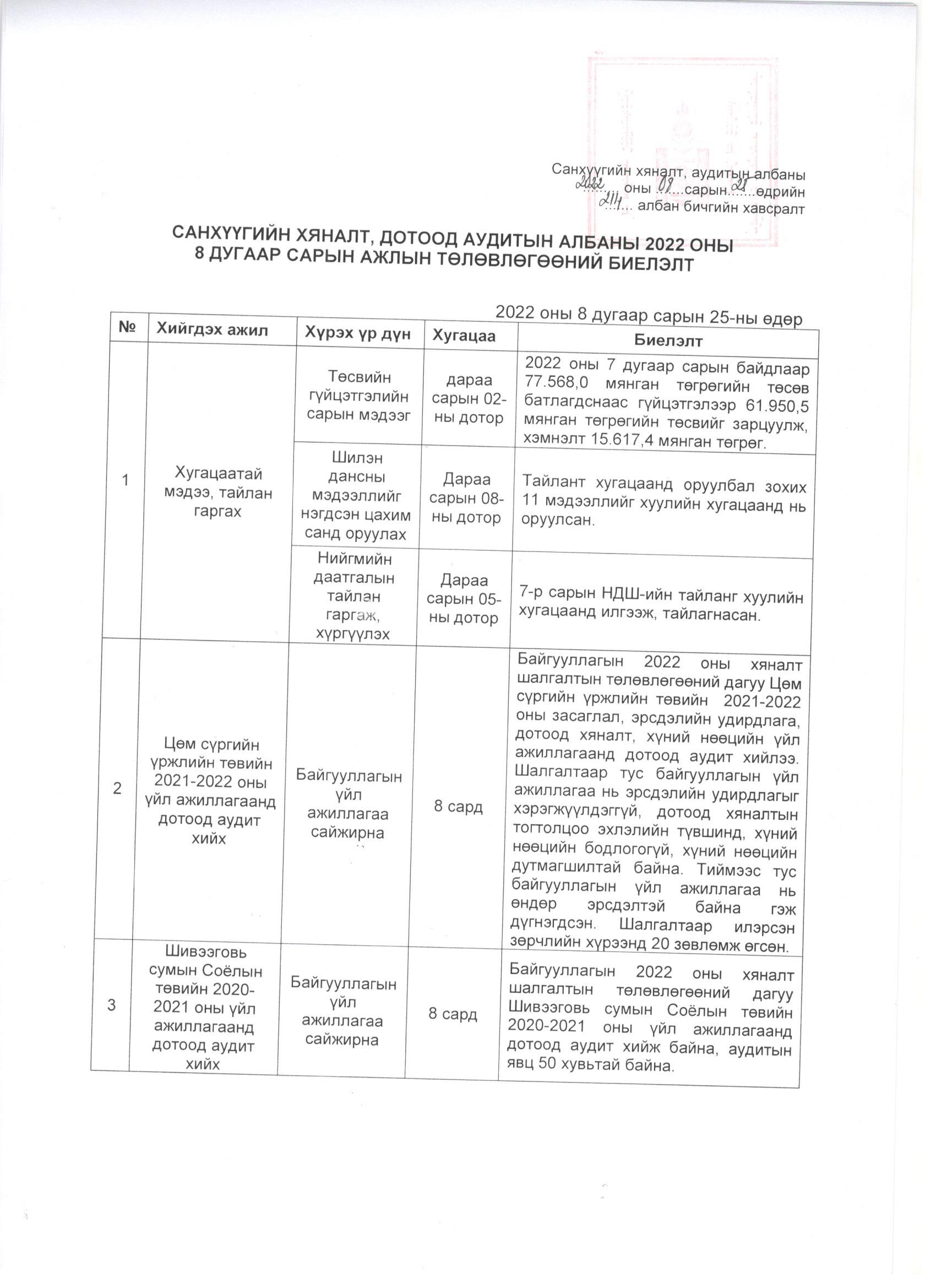 Үйл ажиллагааны тайлан Санхүүгийн хяналт, дотоод аудитын албаны 2022 оны 8 дугаар сарын үйл ажиллагааны тайлан Нийтэлсэн: Админ - 2022-08-26 82