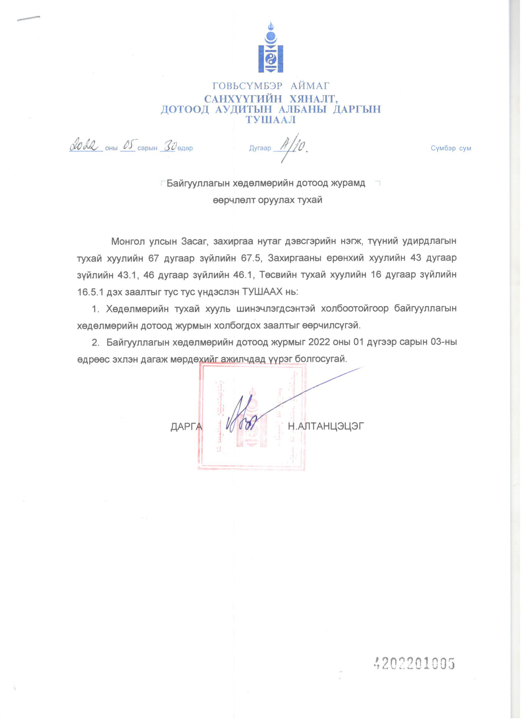 Тушаал 2022-А/10 Байгууллагын хөдөлмөрийн дотоод журамд өөрчлөлт оруулах тухай Нийтэлсэн: Админ - 2022-05-30 76