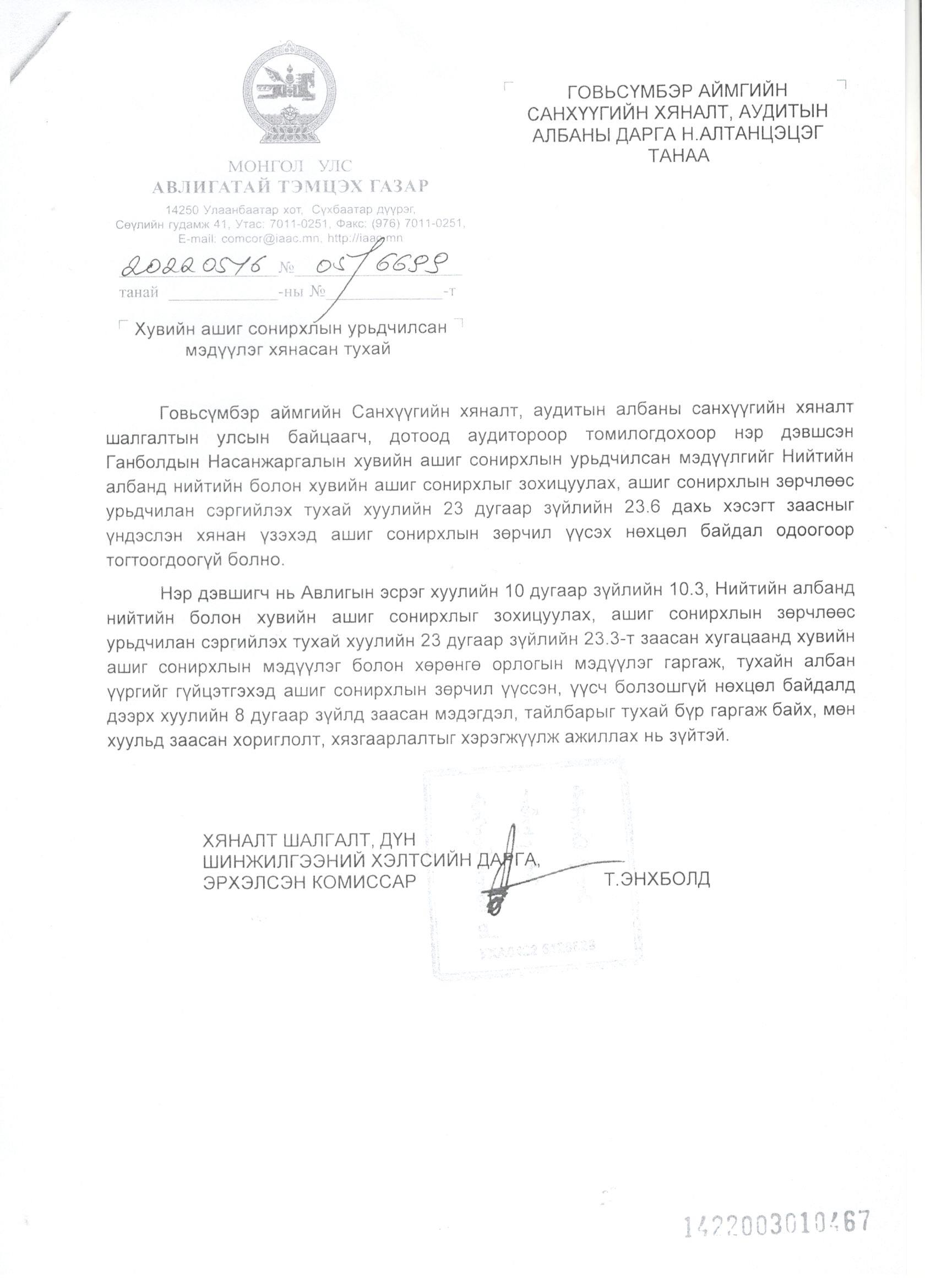 Хүний нөөцийн ил тод байдал Хувийн ашиг сонирхлын урьдчилсан мэдүүлэг хянасан тухай дүгнэлт Нийтэлсэн: Админ - 2022-05-24 94