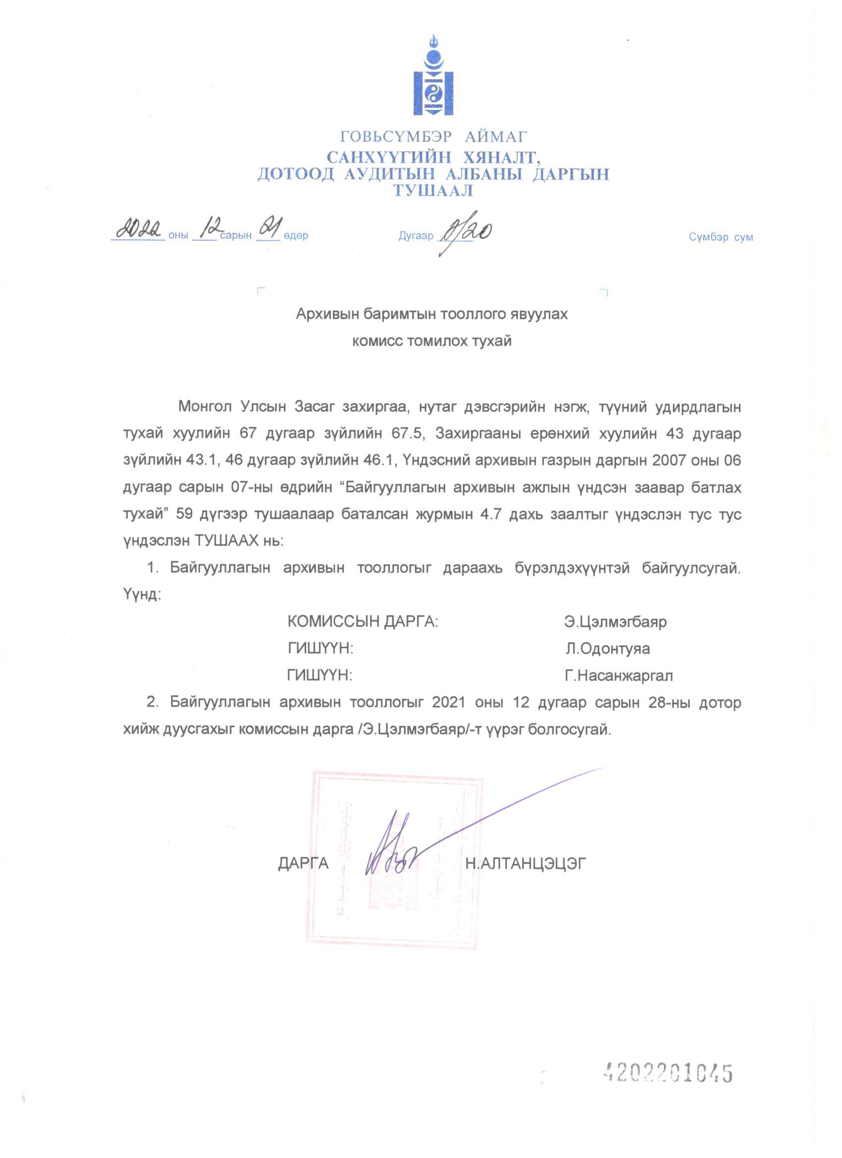 Тушаал 2022-А/20 Архивын баримтын тооллого явуулах комисс томилох тухай Нийтэлсэн: Админ - 2022-12-21 75