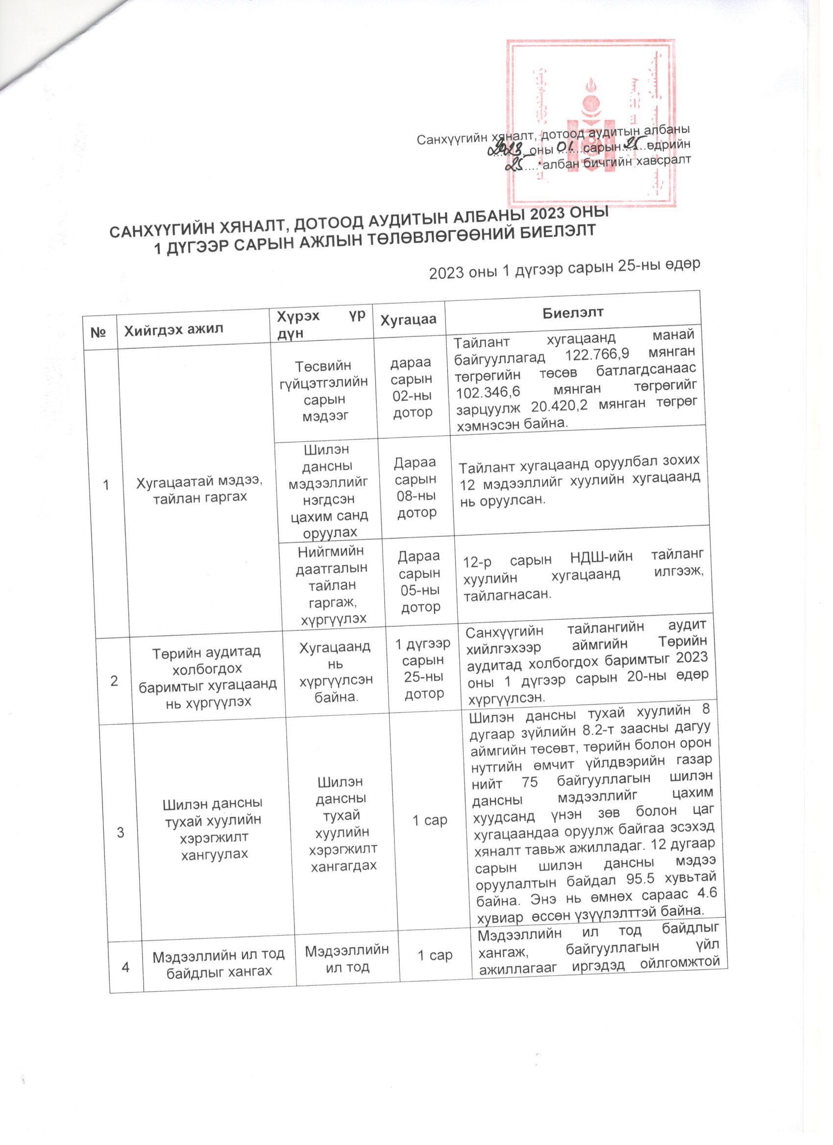 Үйл ажиллагааны тайлан Санхүүгийн хяналт, дотоод аудитын албаны 2023 оны 01 дүгээр сарын үйл ажиллагааны тайлан Нийтэлсэн: Админ - 2023-01-25 73
