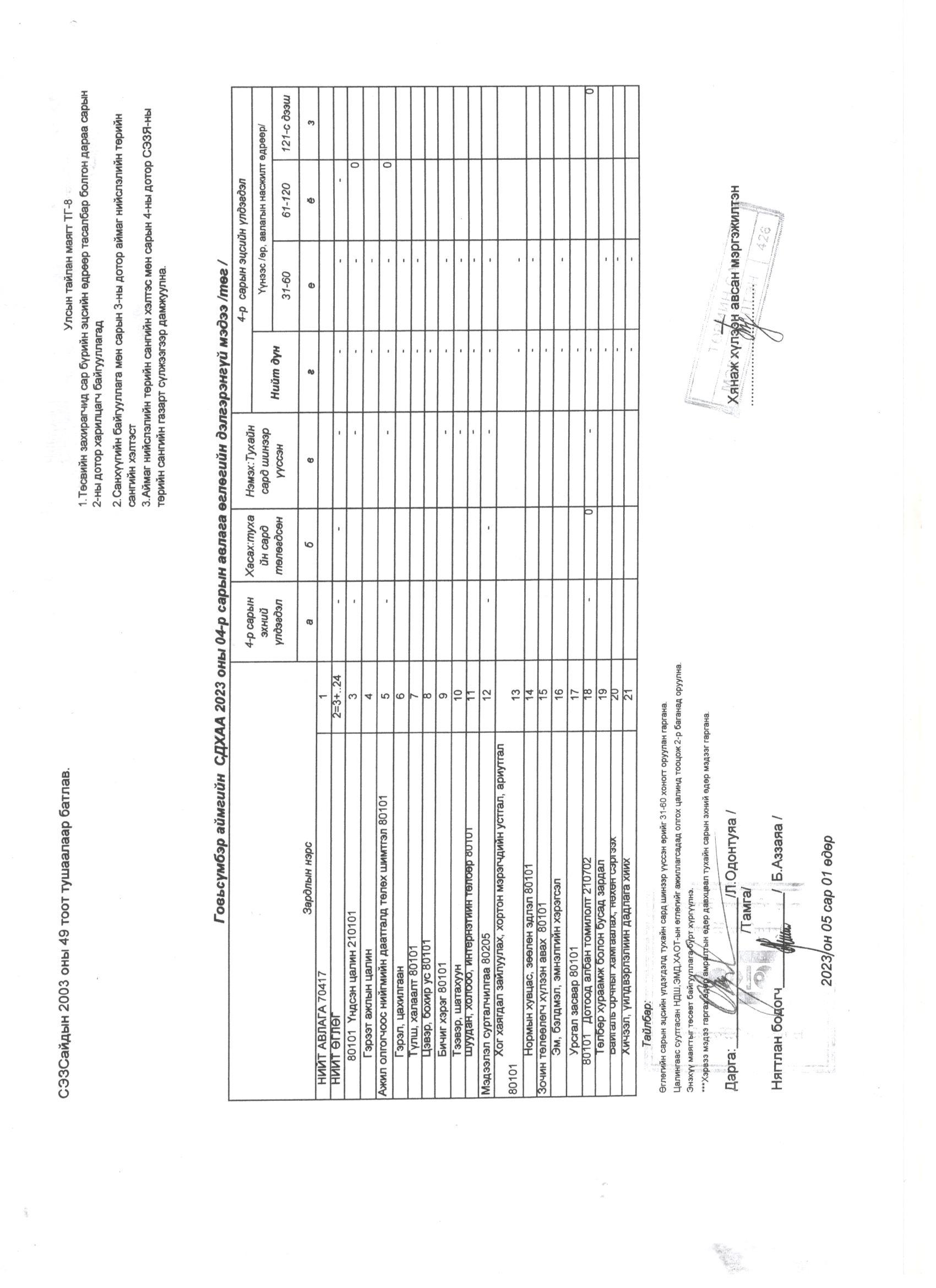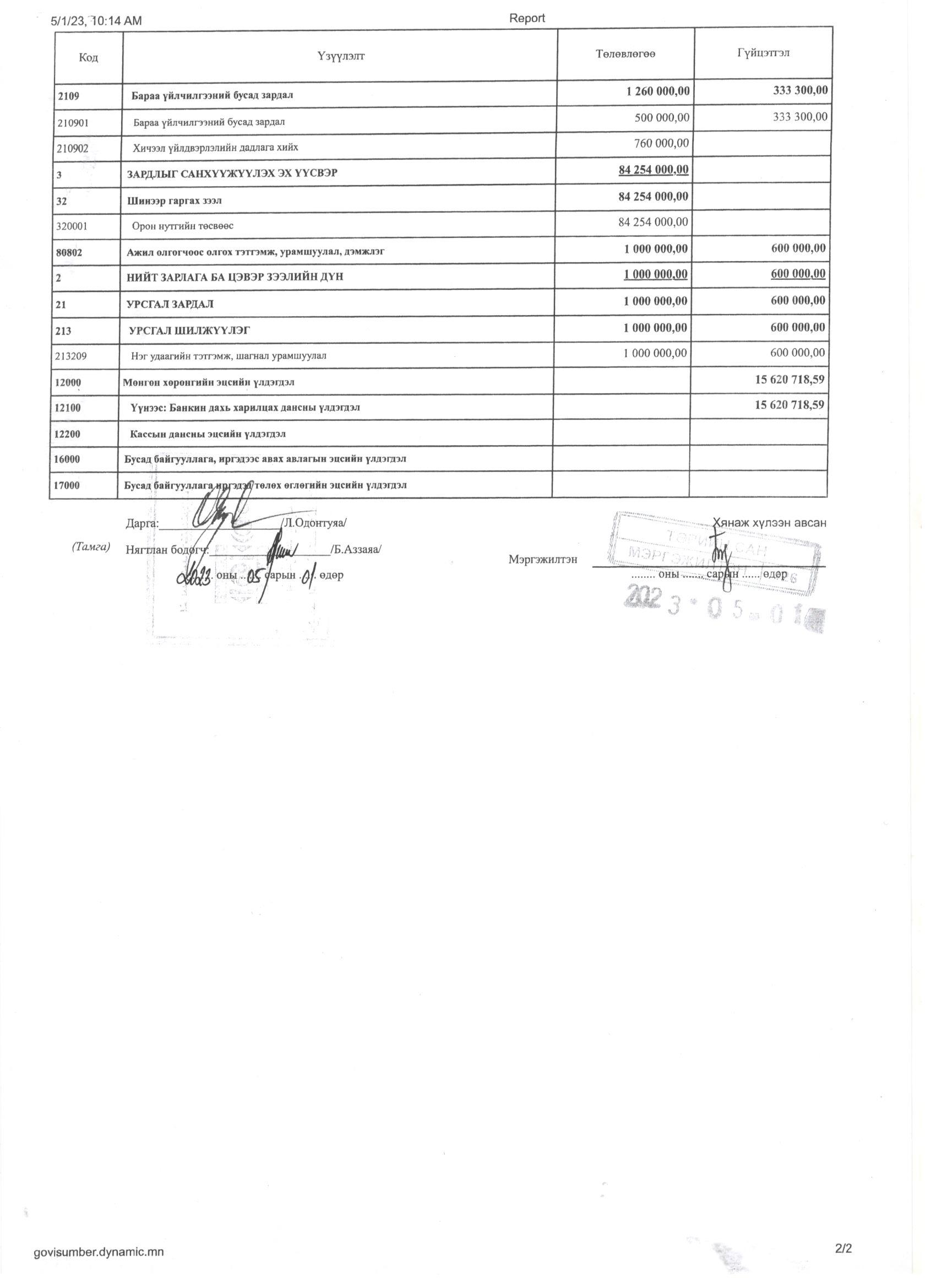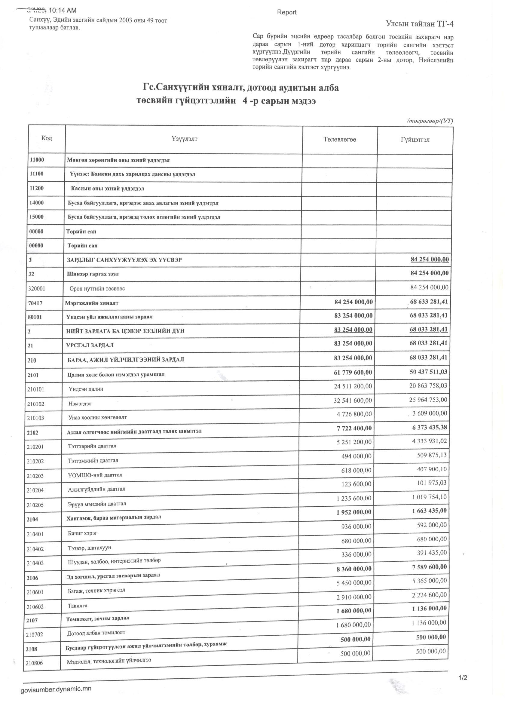 Төсвийн гүйцэтгэлийн сарын мэдээ Санхүүгийн хяналт, дотоод аудитын албаны 2023 оны 04 сарын төсвийн гүйцэтгэлийн мэдээ Нийтэлсэн: Админ - 2023-05-05 97