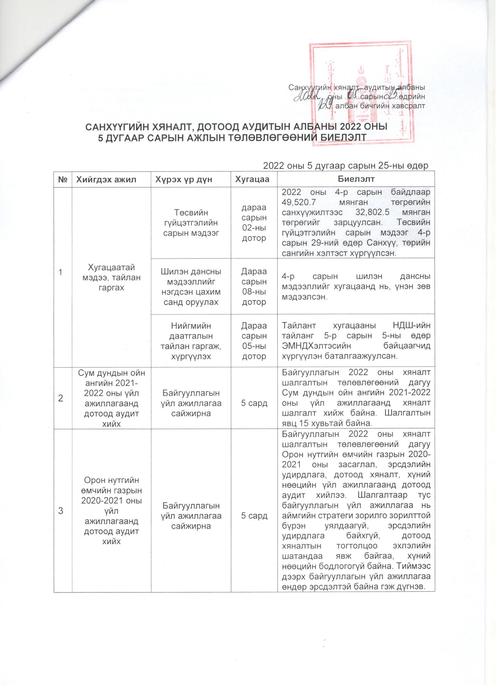 Үйл ажиллагааны тайлан Санхүүгийн хяналт, дотоод аудитын албаны 2022 оны 5 дугаар сарын үйл ажиллагааны тайлан Нийтэлсэн: Админ - 2022-05-26 89