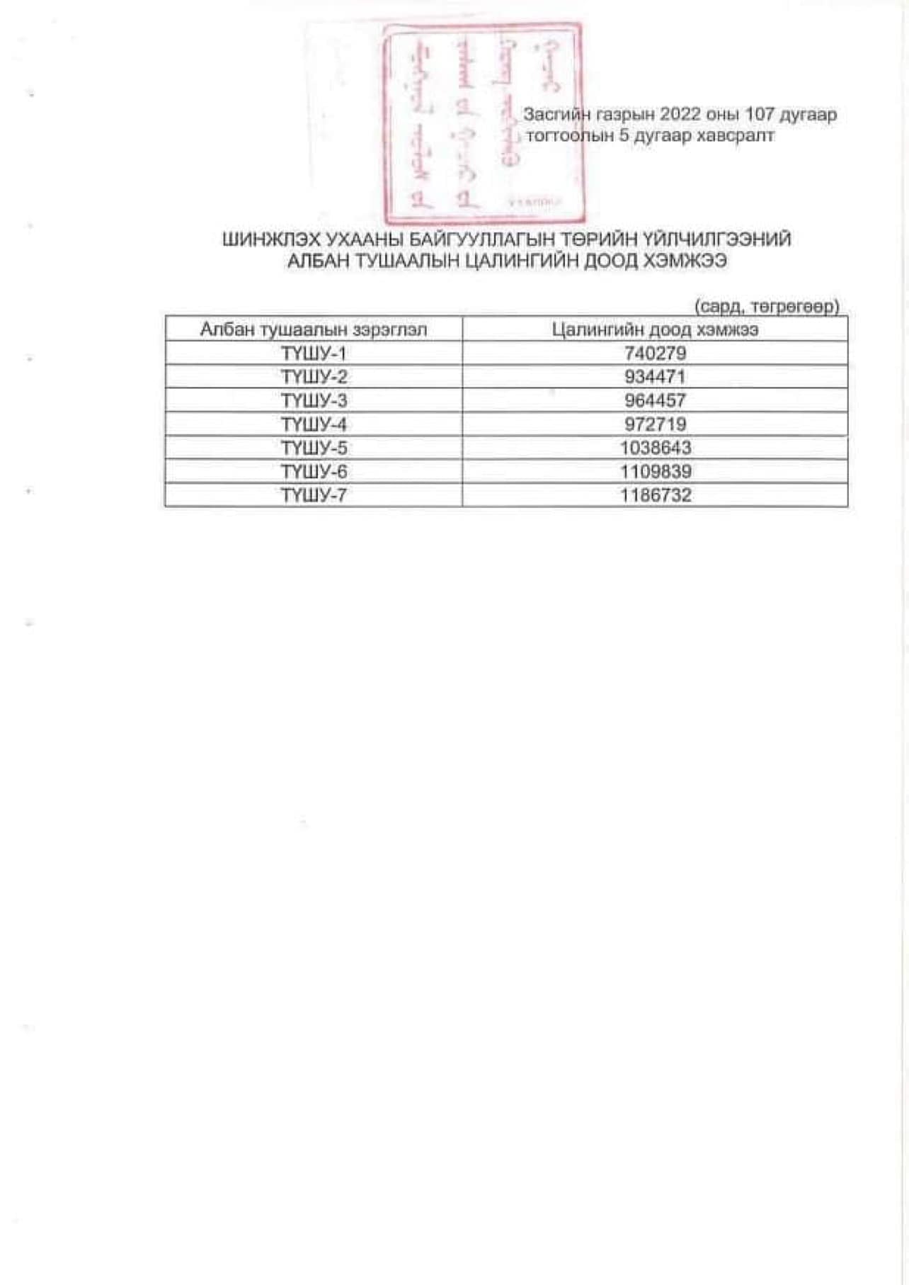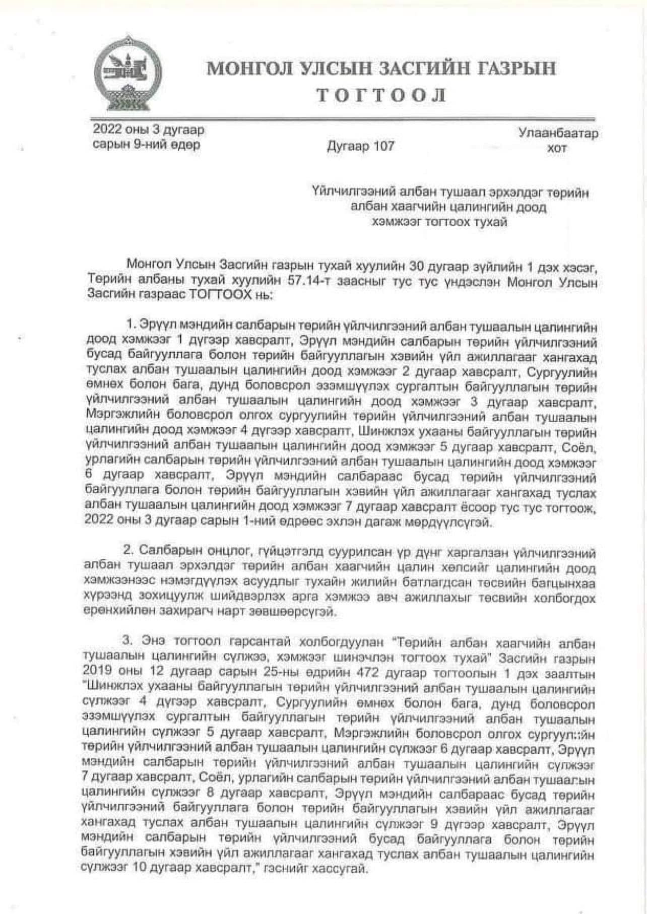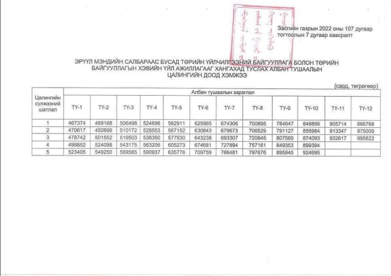 Засгийн газрын тогтоол Үйлчилгээний албан тушаал эрхэлдэг төрийн албан хаагчийн цалингийн доод хэмжээг тогтоох тухай Нийтэлсэн: Админ - 2022-05-30 81