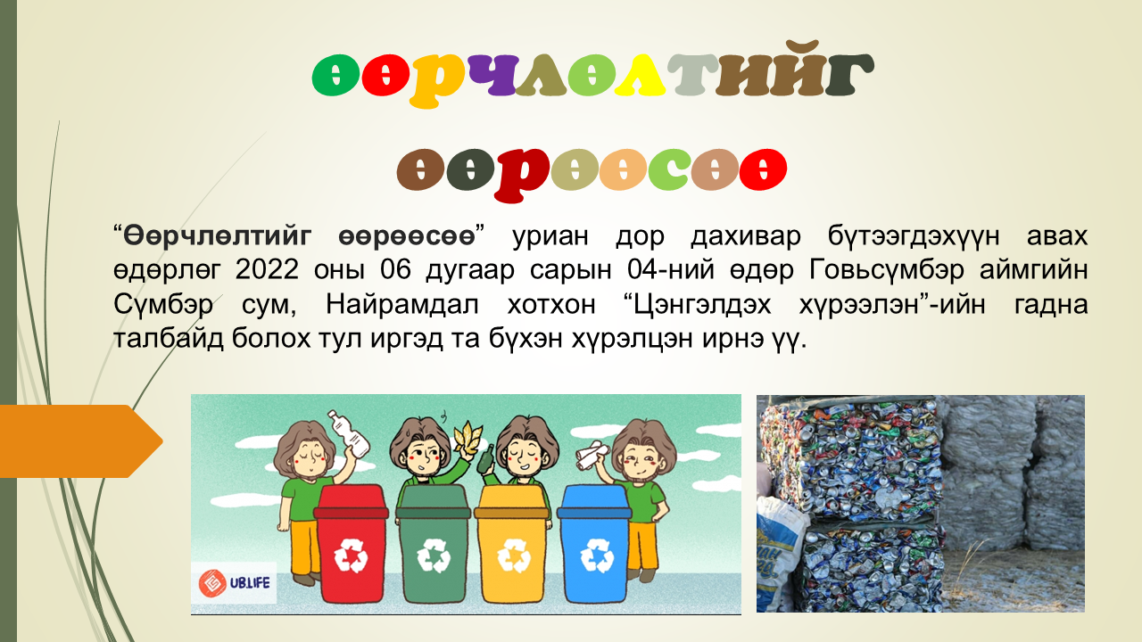 ЦАГ ҮЕИЙН МЭДЭЭ “Өөрчлөлтийг өөрөөсөө” уриан дор дахивар бүтээгдэхүүн авах өдөрлөг 2022 оны 06 дугаар сарын 04-ний өдөр Говьсүмбэр аймгийн Сүмбэр сум, Найрамдал хотхон “Цэнгэлдэх хүрээлэн”-ийн гадна талбайд болох тул иргэд та бүхэн хүрэлцэн ирнэ үү. Нийтэлсэн: Админ - 2022-06-03 88